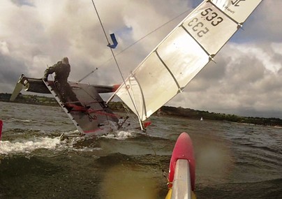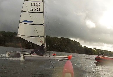 Gareth on trapeze gained upwind and could hold off