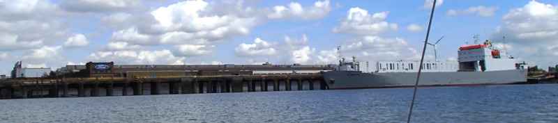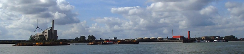 (Above) Passing the Ford factory at Dagenham, and (below) the river very wide, with scattered industrial development. I ran down to Erith (with the sailing club out at slack water) before the turn back on the making tide, beating back easily up the long wide stretches and through the Thames Barrier again (with a sailing barge going downstream though the channel on the other side.)