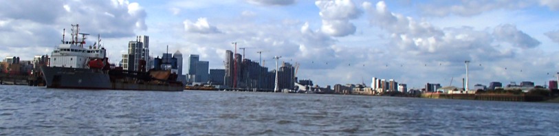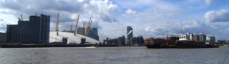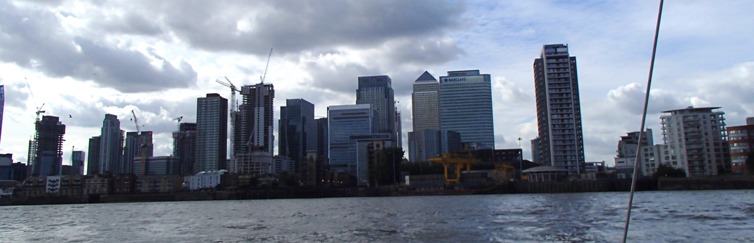 Above: Past the cliffs of the Canary Wharf complex; unsurprisingly the wind coming round it died, puffed, and swung. The tide assistance took me round the corner (below) past the O2 Arena, barges, and the marching residential towers growing beside the Arena.