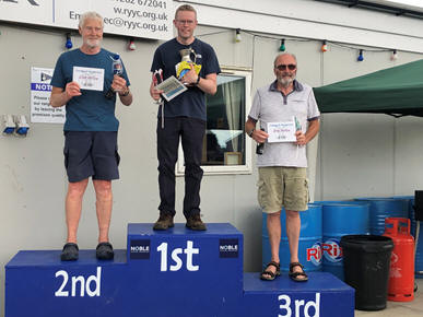 Race 2 This time the tidal flow was stronger, and both John and Stuart went right up the beat, both having gone for port tack starts, Stuart from the pin end and John from the Committee Boat end. They looked to have a good lead as they approached the windward mark, but Gareth, who had gone left, still managed to tuck in under Stuart's lee. Side by side they pursued John. Down the run Gareth went down tide of the rhumb line while Stuart went up tide and rounded the bottom mark in second place. John increased his lead up the beat of Lap 2, while Gareth overtook Stuart, but he could not catch John. The race was shortened at the windward mark of Lap 3, and much to Stuart's chagrin George managed to overhaul him up the last beat to snatch third place by a few boat lengths.